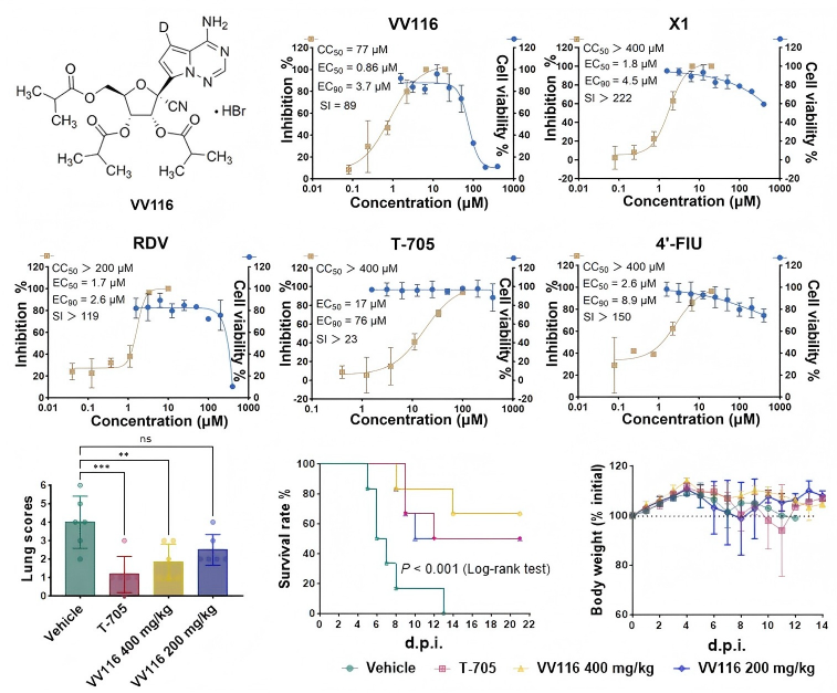 VV116(氢溴酸氘瑞米德韦片)是一种新型口服核苷类抗病毒药物,已先后在乌兹别克斯坦和中国获批上市用于新冠肺炎的治疗。本研究发现,作为一种靶向病毒RNA依赖性RNA聚合酶(RdRp)的前药,体外实验中VV116和其代谢活性分子均展示了对尼帕病毒(包括马来西亚株NiV-M和孟加拉株NiV-B)的显著抑制活性。在金黄地鼠致死剂量感染模型中,VV116以400毫克每千克体重的口服给药剂量下,能将实验动物的存活率提高至66.7%,且显著降低感染靶器官肺、脾和脑中的病毒载量。