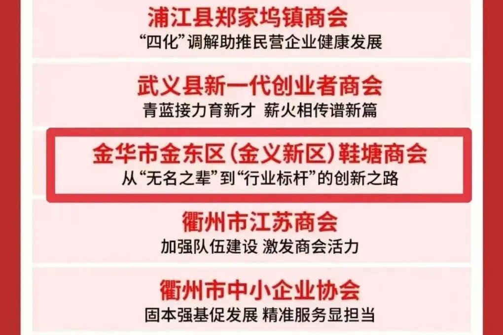 近日,浙江省工商联公布2025年浙江省“四好”商会建设优秀案例名单,全省共50个案例成功入选。其中,金华市金东区(金义新区)鞋塘商会报送的《从“无名之辈”到“行业标杆”的创新之路》案例榜上有名,成为我区商会建设的标杆典范。
