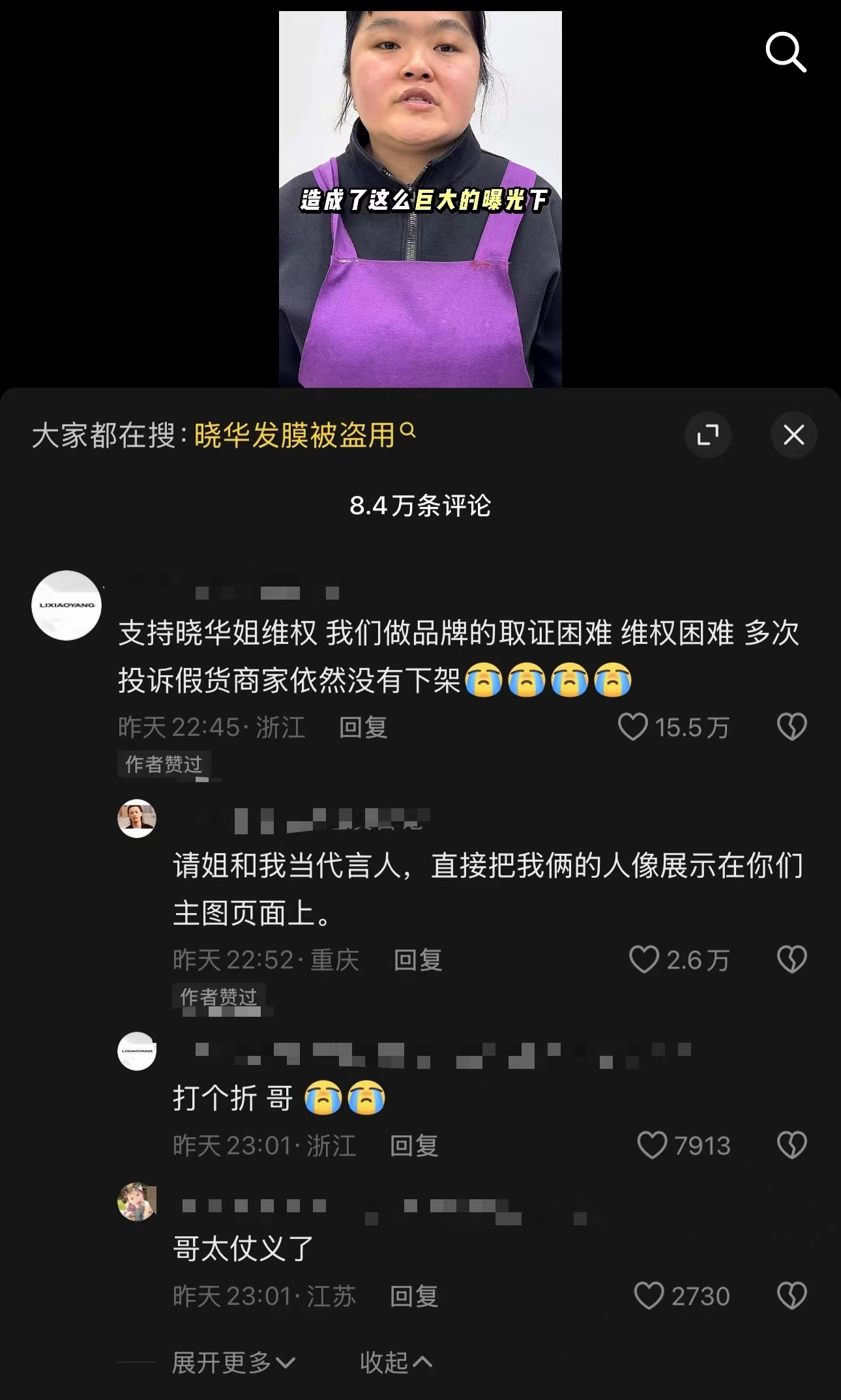 目前,晓华推荐的品牌方表示,“已经让律师取证留存”,并“支持晓华姐维权”“所有费用我们品牌方出了”。